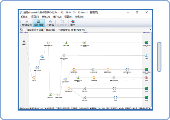 SunuHIE引擎提供了很多灵活组件,能够降低业务厂商的改造工作量,而且能够灵活的支持国家、行业标准的生成实现信息的共享,引擎实现共享的过程并不依赖全量数据中心,相反能够模拟全量数据中心实现跨异构数据库的实时数据整合为前端提供数据服务